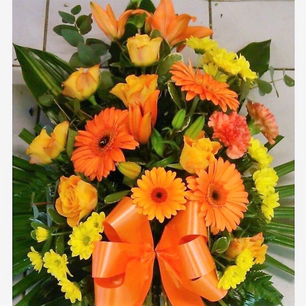 At Reebees we are delighted to present the Orange Spray , This spray is full of colour with Roses, Gerbera, Carnations and seasonal greenery.